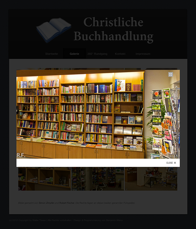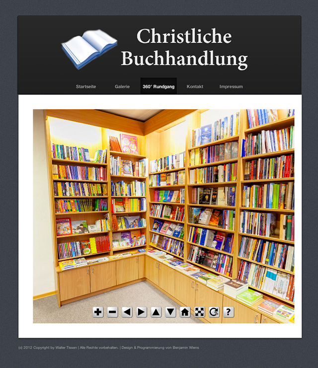 Eine kleine Visitenkarte im Netz ist heutzutage Pflicht. Das wollte auch Walter Tissen, Inhaber und Geschäftsführer der christlichen Buchhandlung, nicht versäumen. Aus der kleine Visitenkarte kam dann noch eine kleine Galerie und ein 360° Rundgang von 360ig.de hinzu. Die Seite untersteht nicht irgendeinem CMS sondern ist rein HTML/CSS/JavaScript. Wert gelegt wurde auf Suchmaschinenoptimierung für Google und Bing, damit der relativ kleine Laden auch überregional besucht wird.