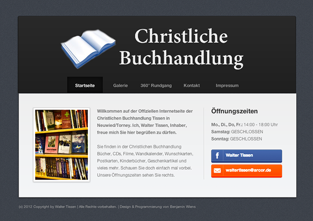 Eine kleine Visitenkarte im Netz ist heutzutage Pflicht. Das wollte auch Walter Tissen, Inhaber und Geschäftsführer der christlichen Buchhandlung, nicht versäumen. Aus der kleine Visitenkarte kam dann noch eine kleine Galerie und ein 360° Rundgang von 360ig.de hinzu. Die Seite untersteht nicht irgendeinem CMS sondern ist rein HTML/CSS/JavaScript. Wert gelegt wurde auf Suchmaschinenoptimierung für Google […]